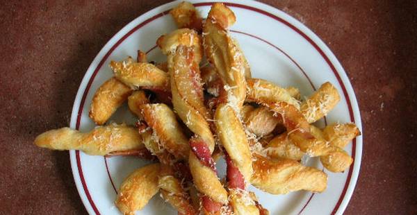 Лиснатото тесто одмрзнете го на собна температура, истанчете го со сукало во правоаголник со дебелина околу 3мм. На едната страна наредете ја сланината и покријте ја со другата половина од тестото.
