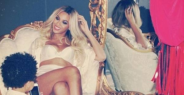 Додека Бијонсе седи во долен веш и наметка, нејзината ќерка стои покрј неа играјќи си со мобилниот телефон.
