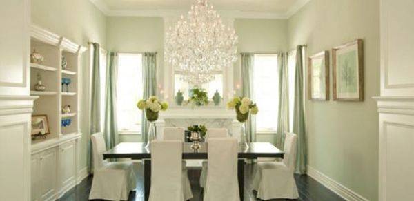 Пастелно зелени ѕидови, во комбинација со темен дрвен под, бел мебел, кремасти елемнти и украси, пастелно зелени завеси, и ѕвездата во просторијата е големиот кристален лустер.