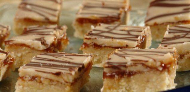Истопете ја белата чоколада со 40 гр маргарин на пареа и прелијте одозгора. Истопете ја црната чоколада со преостанатиот маргарин и со неа направете декорација сипувајќи ја во тенок млаз. Ставете го колачот во фрижидер, па кога добро ќе се излади исечете го на коцки.