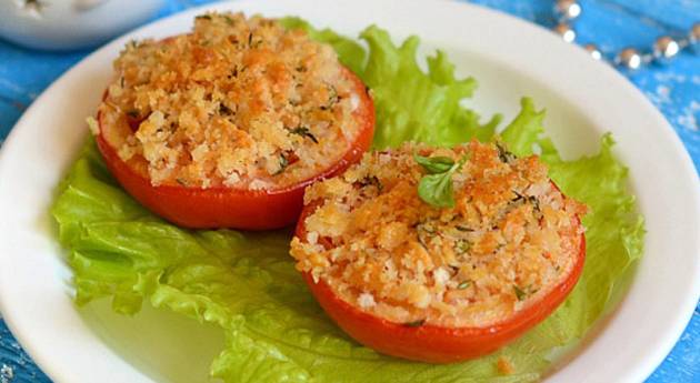 Смесата поделете ја на 6 дела и врз секој домат ставете од смесата.
