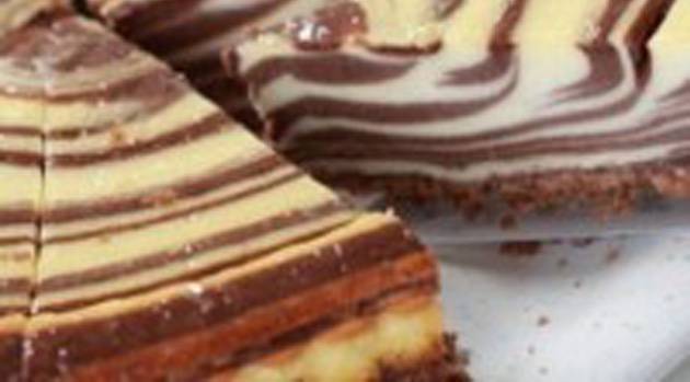 Во овален калап ставете фолија, па истурете ја светлата смеса и дел од темната смеса. Благо измешајте ги додека не добиете црно-бели шари.