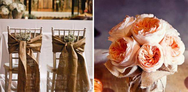 Ленените детали можат да послужат како навлака за столици и за салвети. Интересна идеа и наш фаворит, се ленените торбички за пијалоци…Можеби се многу сурово ориентални за да се постават на свадбената трпеза, но се одлични за хотелскиот декор на асортиманите.
