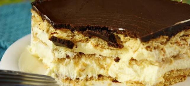 Мала забелешка: Испеченото тесто може да не е насекаде подеднакво пораснато. Не се паничете, искрој те го. Кога ќе го наредите врз филот и кога врз него ќе го ставите преостанатиот фил, на тортата ништо нема да се познава. Поедноставно е и за промена интересно, отколку да правите поединечно еклери.