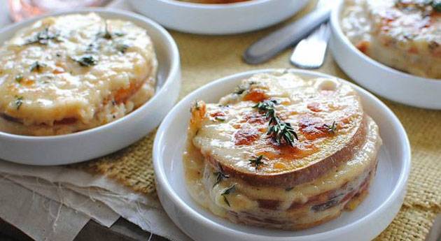 Садот ставете го на тивок оган околу пет минути. Убаво промешајте за да млекото ги впие сите ароми. Компирот исечкајте го на тенки парченца.