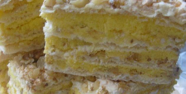 Во сад ставете 3 белки и 150 гр шеќер и изматете ги убаво со миксер да добиете цврст шлаг. Шлагот премачкајте го преку првиот лист од обланда. Посипете со сецкани ореви (околу 80 гр).