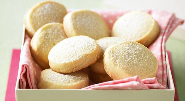 5.Печете околу 12-14 минути или додека не станат бледо жолтеникави. Оставете ги да се оладат добро и попрскајте ги со шеќер во прав пред да ги послужите.