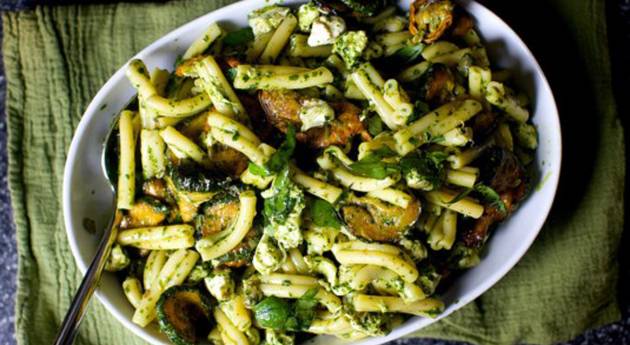 Ставете ја пастата во празен сад. Додадете ги тиквичките и останатите состојки како грашокот, моцарелата, кората од лимон, босилекот и магдоносот итн. Полека мешајте додека не добиете еднаква смеса.