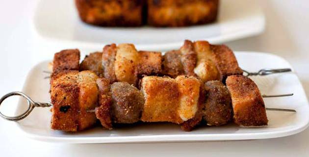На стапчињата за ражнич набоцкјате ги сите состојки. Започнете со леб, кашкавал, салама, кофте па процедурата повторете ја. Готовите ражници извалкајте ги во јајце и презла помешана со брашно.