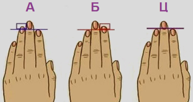 На сликата се претставени три типа на дланка: А, Б и Ц. На секој од нив, соодносот на должината на показалецот, средниот прст и венчалниот прст е различен. Исправете ги дланките и пронајдете ја структурата која најмногу ви одговара. Потоа прочитајте го објаснувањето.