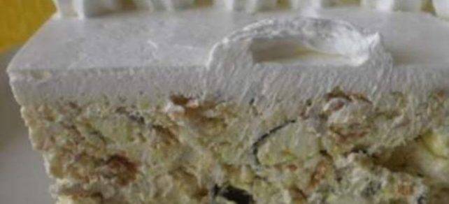 Во поголем сад со миксер изматете ги киселата и слатката павлака со шеќер во прав. Во смесата додадете бисквите искршени на поголеми парчиња, потоа и крем бананите искршени на помали парчиња па рачно измешајте. Смесата исипете ја во соодветен сад. Украсете ја тортата со шлаг крем. Ако е потребно може веднаш да се сервира, но би било најдобро пред сервирање да се олади во фрижидер.