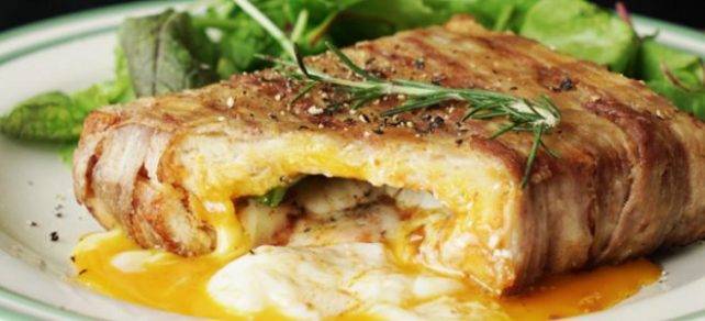 3. Замотајте го целосно со парчињата сланина и пржете го во тава по 2 минути од секоја страна. Прекријте го садот и пржете уште 6 минути.