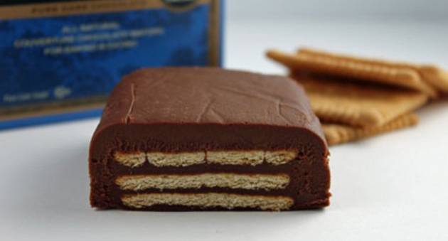 Во длабока тепсија обложете хартија за готвење. Дното премачкајте го со дебел слој од чоколадната смеса, и наредете ги бисквитите едни до други. Повторете го овој процес додека не дојдете до посакуваната висина на колачот.