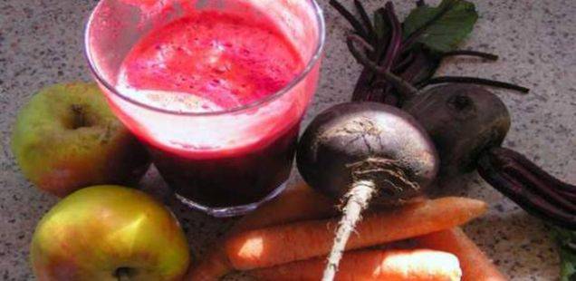 ● Цвеклото, морковот и јаболките излупете ги, исечете ги на помали парчиња, ставете ги во соковник и направете сок.