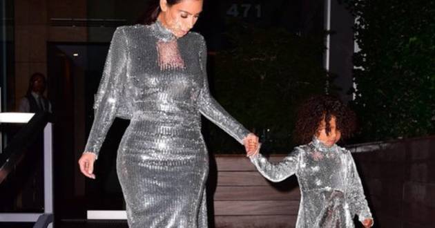 Ким и Норт заблескаа во исти сребрени фустани со што веднаш го привлекоа вниманието на фотографите и обожавателите. Тие поминаа фатени за рака, а единствената разлика во нивните креации беше тоа што Ким носеше проѕирни штикли од брендот Yeezy, додека пак Норт лесно чекореше во патики.