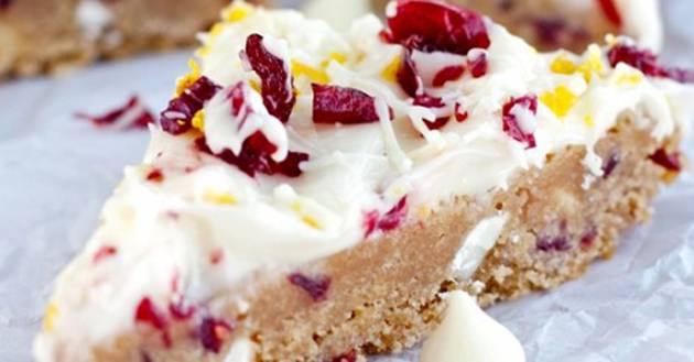 Распоредете го преливот рамномерно врз колачите. Одозгора испрскајте ги со брусница и остатокот од кората од портокал. Декорирајте го остатокот од бело чоколадо и ставете ги во фрижидер за малку да се стегнат.