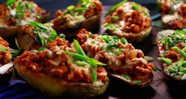 Печете ги исчистените компири половина час на 200 степени. Потоа извадете ги од рерната, исечете ги на половина по должина и издлабете ги со лажица. Посолете ги, наполнете ги со сосот од месо и печете ги уште 2-3 минути.