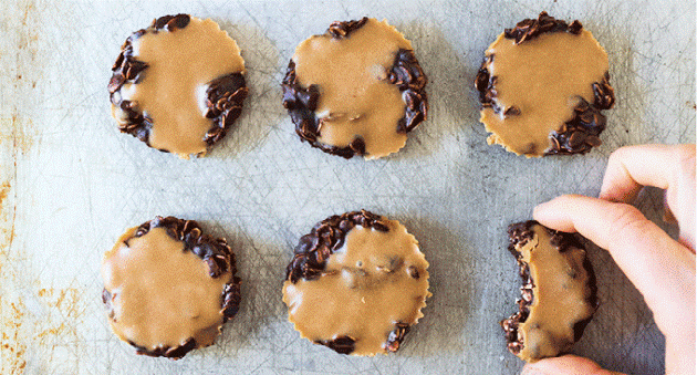Во мал сад на тивок оган, стопете 5 лажици кокосово масло и измешајте заедно 2 лажици путер од кикирики. Додадете ¼ чаша јаворов сируп, ¼ чаша какао во прав, 1 лажичка екстракт од ванила и 1 прстофат кошер сол. Кога целосно ќе се искомбинираат состојките, тргнете ги од оган и измешајте 1 чаша овесни снегулки. Со помош на лажица префрлете ја смесата во калапите. Додека ја правите смесата од путер од кикирики, оставете го садот во фрижидер, за мафините да се стегнат.
