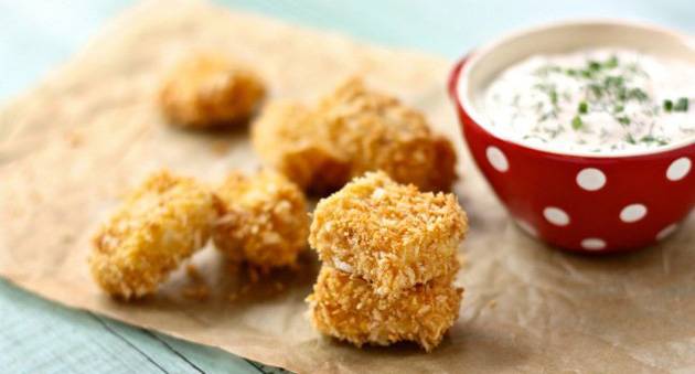 Исецканите коцкички пилешко тркалајте ги во пченкарно брашно, потоа презла, јајце, па сол и бибер. На крајот тркалајте ги во рендан пармезан. Ставете хартија за печење на една тава и загрејте ја рерната на 200 степени. Наредете ги коцките пилешко и печете ги во рерна половина час или додека не добијат убава златна боја.