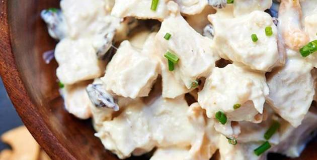 Додека се варат пилешките гради направете го сосот. Изматете го јогуртот со сенфот, и додадете лук во прав по желба. Додадете сол и бибер по вкус. Потоа додадете го сувото грозје и индиските ореви.