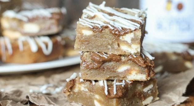 Смесата ставете ја во плех за печење и одозгора премачкајте ја со путерот од кикирики.