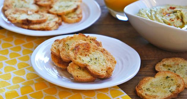 Багетот исечете го на кришки од 3 милиметри. Потоа намачкајте ги со смесата од путер и печете ги во загреаната рерна 10 минути, додека да добијат убава кафена боја и да станат крцкави. Послужете ги топли или оладени по ваша желба.