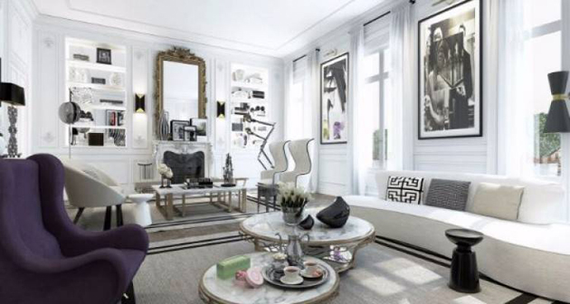 Главниот декор на оваа просторија е нагласен со месинган акцент, кои придонесуваат за конечен луксузен амбиент на собата. Подот е од природно дрво и кое емитува топлина, без да се меша секако со елеганцијата која моѓе да се забележи тука.Просторот во дневната соба се шири покрај додатокот за седење во кој црно-белата тема е надополнета со темно виолетова нијанса.