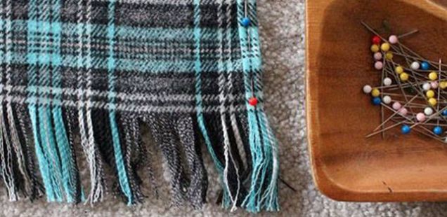 Долгите страни свиткајте ги и закачете ги со шпенадли, а потоа користејќи машина за шиење зашијте ги рабовите и на тој начин порабете го шалот.