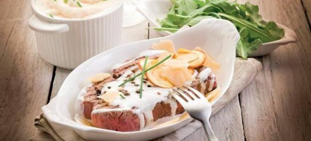 Исчистете го месото и исечете го на дебели шницли, додадете морска сол и мелен бибер. Исцедете лимон, шницлите попрскајте ги со сокот и прелијте со вино, па оставете ги да стојат во фрижидер неколку часа. Потоа месото испржете го на загреано масло. Ако не сакате месото да биде живо, пржете го подолго, па тивок оган и често вртете го од двете страни. Пред крајот на месото додадете брашно и додадете ја истолчената сардина. Додадете павлака за готвење и уште малку на тивко крчкајте. Павлаката можете да ја загреете одвоено и со неа да го прелиете подготвеното месо. На крајот посипете со зелен бибер.