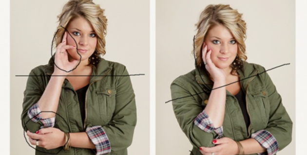 Спуштањето на рамената под одреден агол ќе направи вашиот врат да изгледа подолго и ќе ви даде целосно порелаксирано држење. Исто така, не ги кријте дланките. На втората слика подолу, рацете на моделот се близу нејзините лакти – ова изгледа многу подобро.