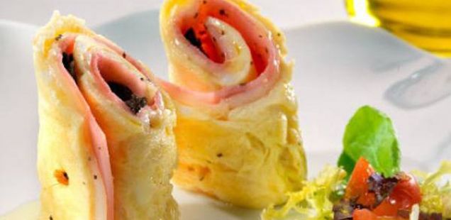 Во зависност од бројот на ролнички кои ќе ги правите и големината на тавчето поделете ги јајцата. Изаметните јајца ставете ги во тава да се пржат. Посолете ги. Внимавајте слојот да не е многу дебел. Потоа ставете го кашкавалот, и веднаш ставете ја шунката и посолете ги со оригано. Извадете ги јајцата на една чинија, ставете ги исецканите маслинки и свиткајте ги во ролна. Потоа исецкајте ги на мали парчиња.