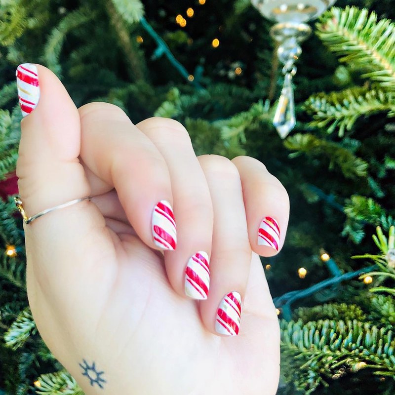 Популарни се и белите нокти со црвени пруги, кои неодоливо потсетуваат на шарените пеперминт бонбони, кои се синоним за новогодишните празници.