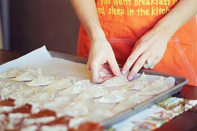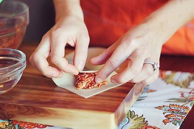 Оформете нова кора 2 до 3 кори за за баклава. Така оформената кора исечете ја на коцки секоја нова оформена кора.  Секоја ново-оформена коцка кора наполнете ја со претходно приготвениот фил. Секоја пица-баклава премачкајте ја со масло, насипете рендан пармезан  и печете во тава на која претходно сте ставиле хартија за печење.