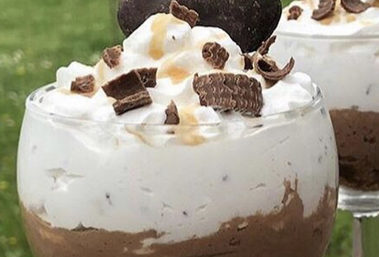 На дното на десертната чаша ставете 1-2 лажички мелени бисквити и прелејте со карамел прелив.