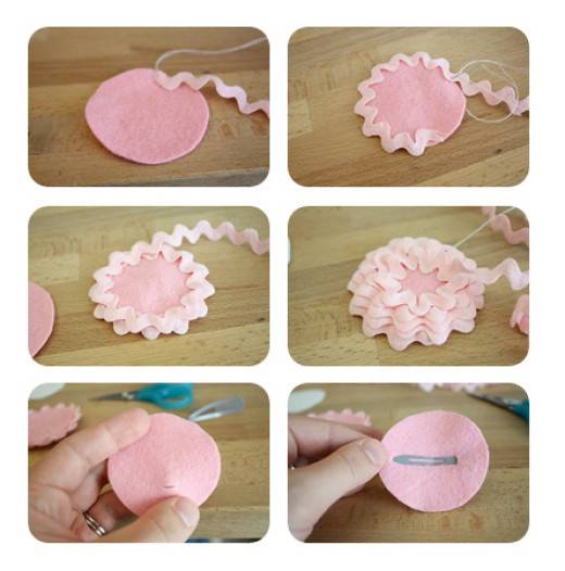 Мало парче филц исечете го во круг. Тоа ќе биде подлогата. Исечете ја украсната трака во цик – цак форма како на сликата. Потоа со игла и конец почнете да ја прицврстувате на кругот од надворешната страна. Откако ќе го завршите првиот круг, започнете нов круг и така сè додека не ја пополните целата подлога. Секој пат кога почнувате нов круг малку поместете ја траката навнатре, така што надворешните лакови останат видливи.