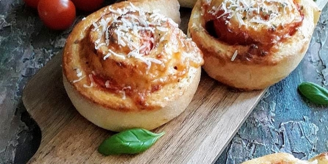Тестото развлечете го во правоаголник 50×80 и намачкајте го со кечап. Наредете ги исечените печени пиперки, cherry доматите, а потоа наросете рендано сирење и исецкан босилек. Замотајте го во ролат, исечете го на парчиња околу 1,5-2 см ширина. Пицетите наредете ги на плех за печење, премачкајте ги со изматено јајце и наросете суво оригано.