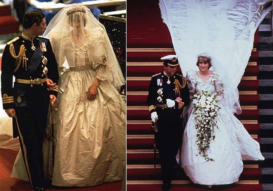 На нејзината свадба со принцот Чарлс, Дијана го носеше најгламурозниот фустан на сите времиња. Направен од чиста свила, декориран со рачно изработена чипка, со вградени 10. 000 бисери. Креиран од Елизабета и Дејвид Емануел и имаше драматичен вел  кој се протегаше цели 7,5 м.