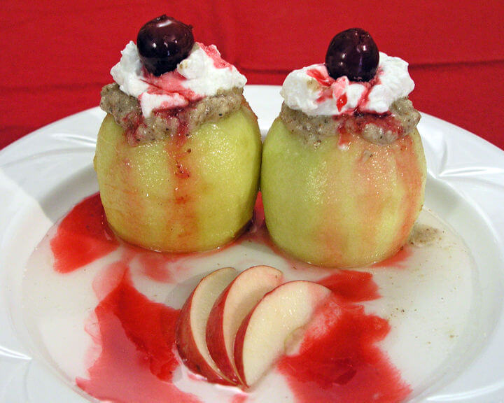 Јаболка варени во сладок сируп, полнети со слатка смеса од ореви, збогатени со слатка павлака и сладок сируп од вишни, тоа се – Слатките туфахии!