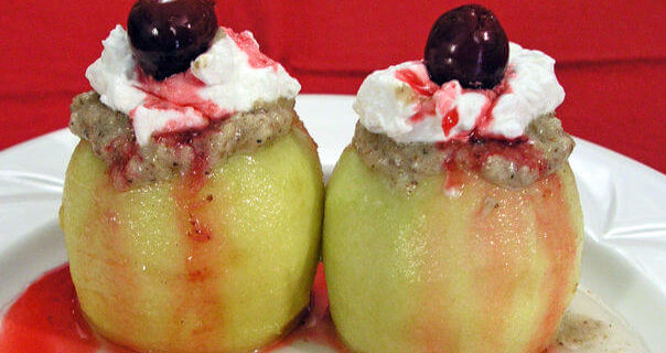 Јаболка варени во сладок сируп, полнети со слатка смеса од ореви, збогатени со слатка павлака и сладок сируп од вишни, тоа се – Слатките туфахии!