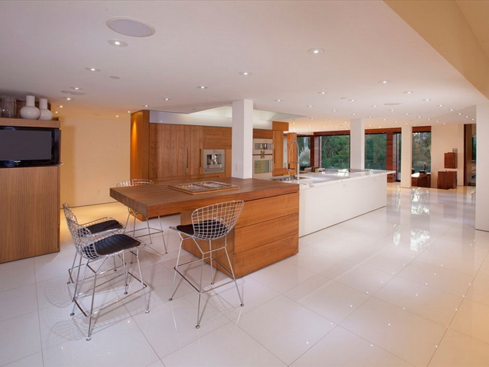 Блескавите порцелански плочки и деталите изработени од бразилски орев во дневната соба само ја дополнуваат совршената слика на оваа просторија, заедно со 24 метарскиот бетонски камин и бар направен од ореово дрво, идеален за семејните забави.