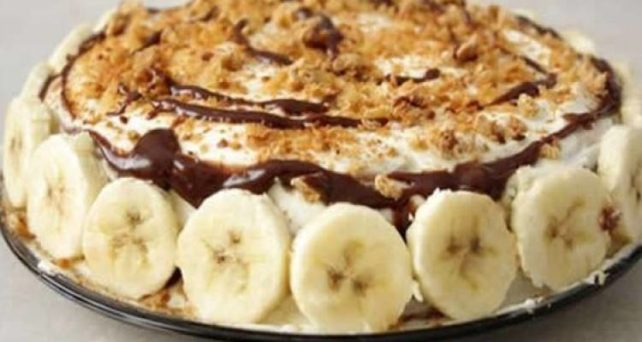 Во средината ставете исецкани 2 банани и врз нив другиот дел од смесата.