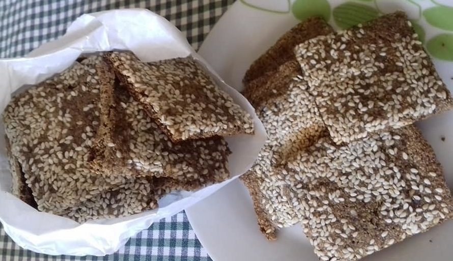 Ставете ја смесата на хартија за печење подмачкана со масло и измазнете ја да биде околу 1/2 см дебела. Посипете со сусам и ставете да се пече на 180 степени Целзиусови околу 40 минути.