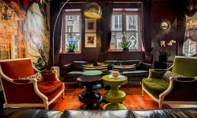 Францускиот дизајнер и дал на секоја соба свој стил во хотелот “Hôtel du Petit Moulin”, со панорамски тапети, декориран мек тапацир и богати нијанси.