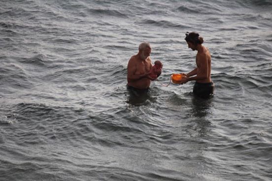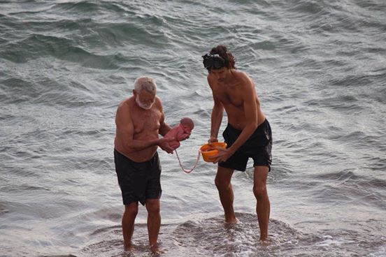 На фотографиите е постар човек кој го носи бебе и се верува дека е доктор кој е специјализиран за раѓање во вода, така што се претпоставува дека сè е планирано.