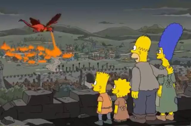 Всушност, во епизодата на „Симпсонови“ под наслов “Serfons” од 2017 година, Барт, Лиза, Хомер и Марџ го гледаат змејот што го уништува нивното село.