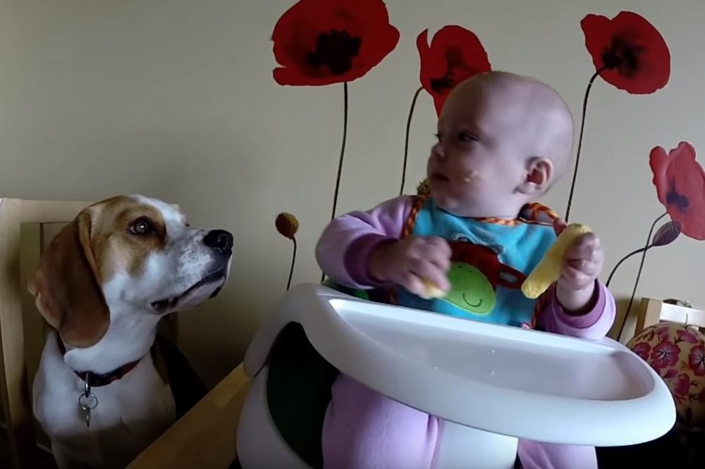 Овој мал Бигл не само што се игра, туку и се грижи за малото бебе Лаура.