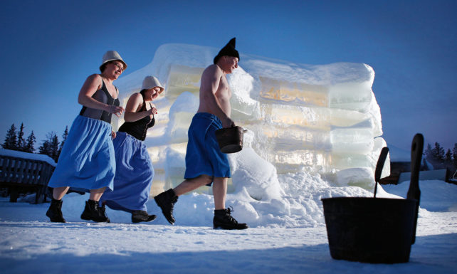 До 10 луѓе можат да влезат во иглото одеднаш, а кога ќе дојде време да се симнат надолу, обичајот диктира да се фрлите во дупка во мразот и да уживате во зимското капење.