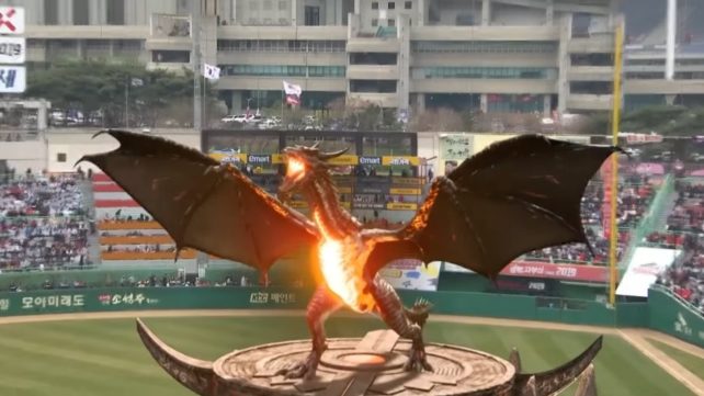На отворањето на бејзбол сезоната на првенство во Јужна Кореја, публиката имаше што да види – змеј леташе околу стадионот, го гребеше екранот, ги кршеше трибините и фрлаше оган!