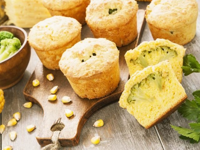 Подгответе го калапот за печење мафини, ставете неколку цветчиња од брокула, малку сецкана шунка во секоја корпичка и истурете ја смесата врз нив.