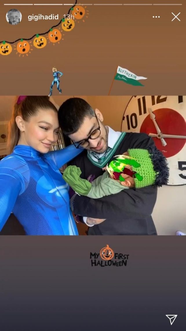 Се чини дека девојчето беше претворено во Халк за нејзината прва Ноќ на вештерките, облечено во зелена кошула и зелена плетена капа со црна коса што излегуваше од горниот дел. Џиџи, во меѓувреме се облече како лик од видео играта Валорант, додека Зајн беше претворен во член на Слитерин Хаус. Џиџи ја објави фотографијата на нејзиниот Инстаграм профил заедно со гиф на кој пишува „Мојата прва Ноќ на вештерките“.
